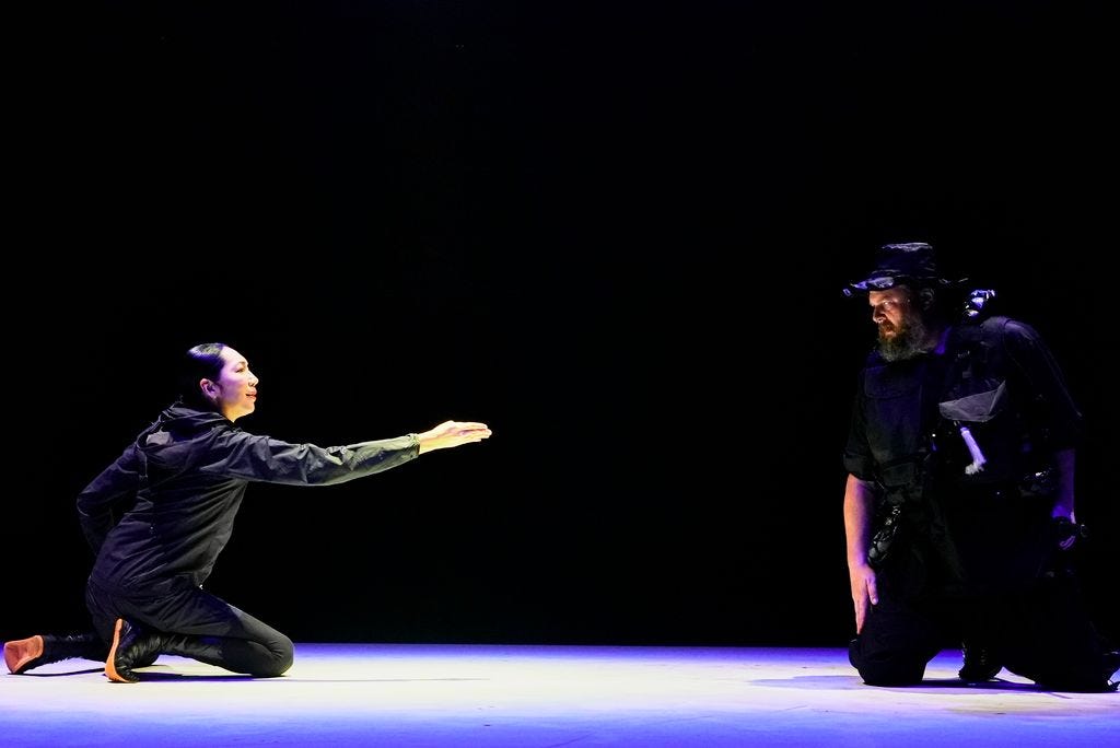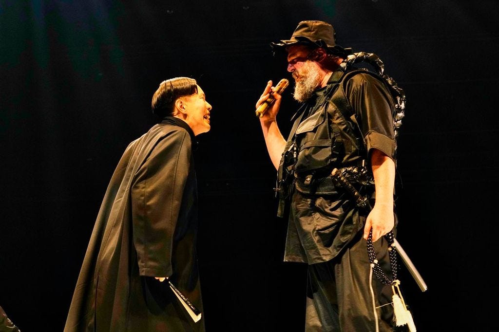Kabuki is a popular art dating from the Edo period. The characters are larger than life, the delivery expressive; there is dance, stylized movement, combat, the doubling and tripling of roles. This weekend at the Japan Society I saw Kanjincho, a classic kabuki play, reinterpreted by the playwright Yuichi Kinoshita for Kinoshita Kabuki. (The performance was part of the Under the Radar festival.) The story, drawn from Noh, revolves around the escape of a defeated nobleman and warrior, Yoshitsune, across a border. He is disguised as a porter, and accompanied by his faithful squire, Benko, and several guards. At a checkpoint, they must convince a guard to let them pass. Resourceful Benkei tries several ruses, even resorting to beating his master—offending the moral order—in order to convince the guard that the man is not Yoshitsune. The guard suspects the truth, but lets him pass anyway. It's a play about loyalty, trust, and humility, the power of performance, and man's willingness, at times, to look the other way. The guard lets Yoshitsune through because he is so impressed by the lengths Benkei is willing to go to save his master. He knows he will be punished by death for his lapse. The atmosphere is heightened.Here, the play is performed in a hybrid modern-traditional style. There is stylized movement, like slow-motion walking and beautiful gesturing with the hands and fans. But also rock music, rap, beats, and pulsating light. A battle early on looks like a video game, and at one point the actors break out in song, like a boy band. And my favorite idea: an actor vocalizes the sound of the shamisen, the traditional instrument that accompanies Kabuki. Benkei is played by an American actor, Lee V, who looks more like Falstaff than a Japanese warrior. Yoshitsune is the wonderfully still Noemi Takayama, a transgender woman actor with a powerful, deep voice. Many of the innovations work well, adding humor and strangeness to the tale. (The boy-band moment is the least convincing bit.) Despite the humor, there is a lot of tension. I was struck by this line:"Our world is in chaos, overrun with dread." I must say, it hits particularly close to home. Photos by Ayumi Sakamoto.