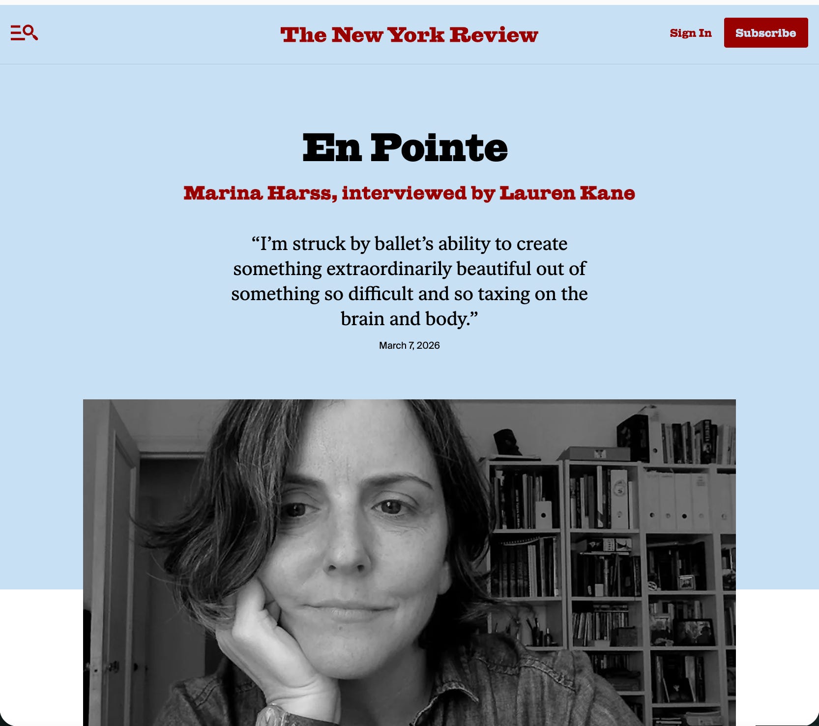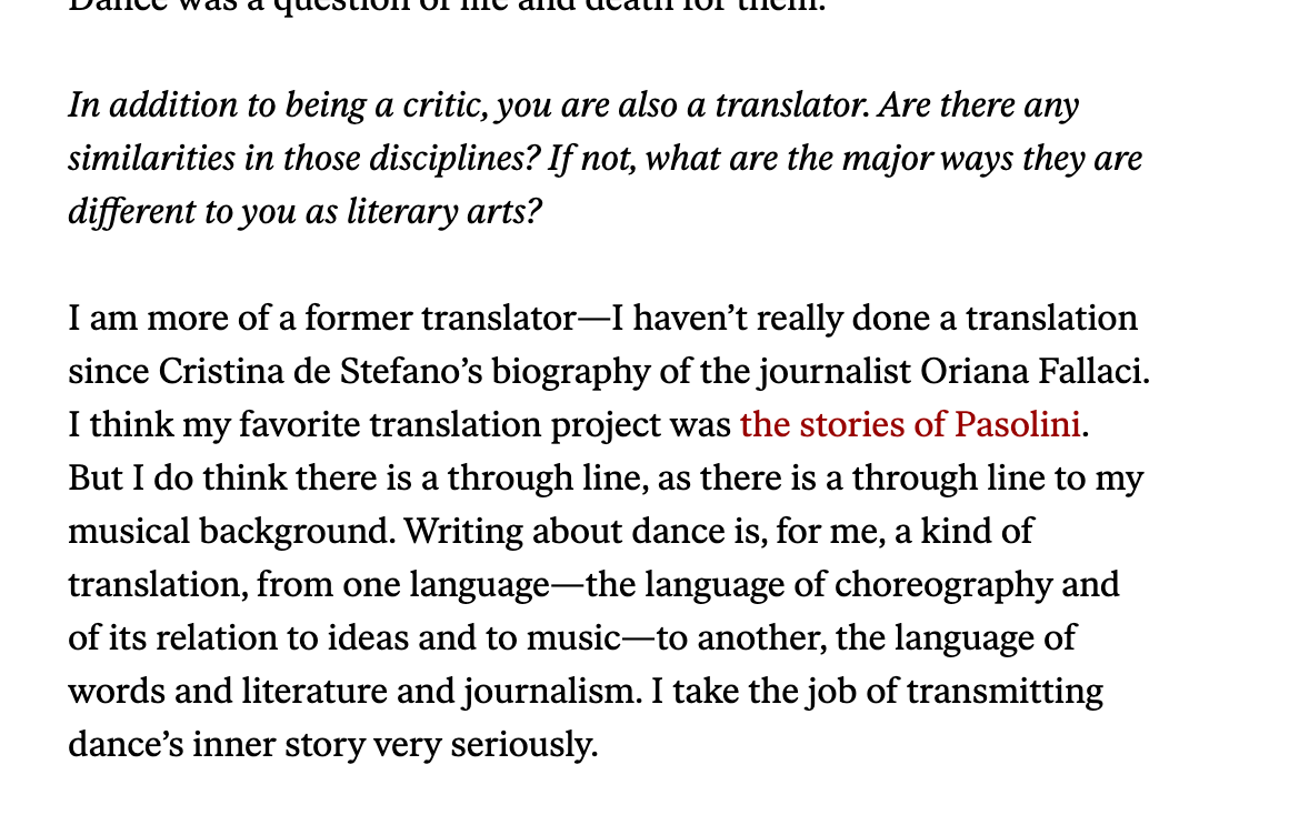 A conversation with the New York Review of Books’ managing editor, Lauren Kane, about dance, dance writing and its similarity to literary translation, and the challenges of biographical writing. Link here.